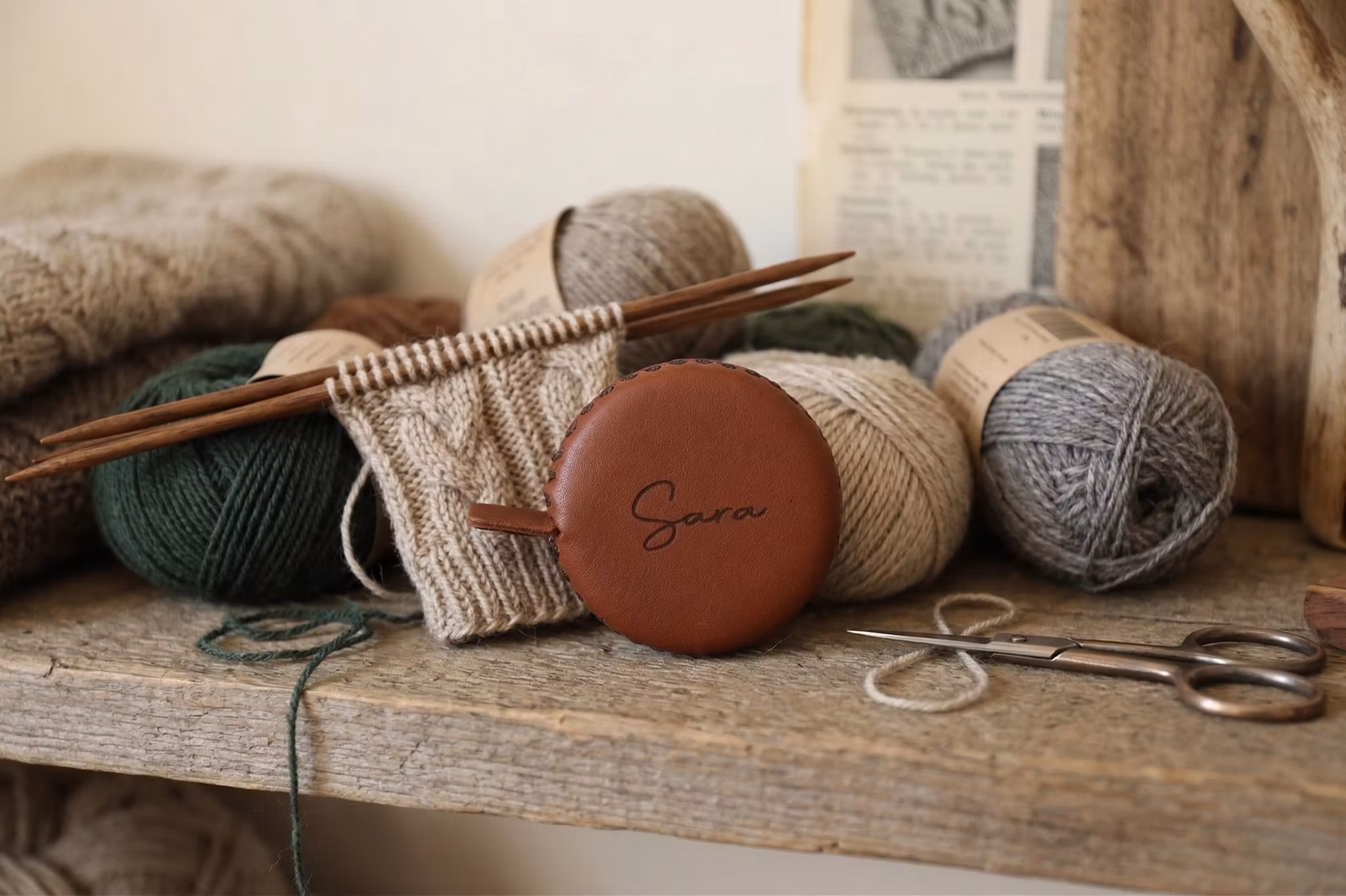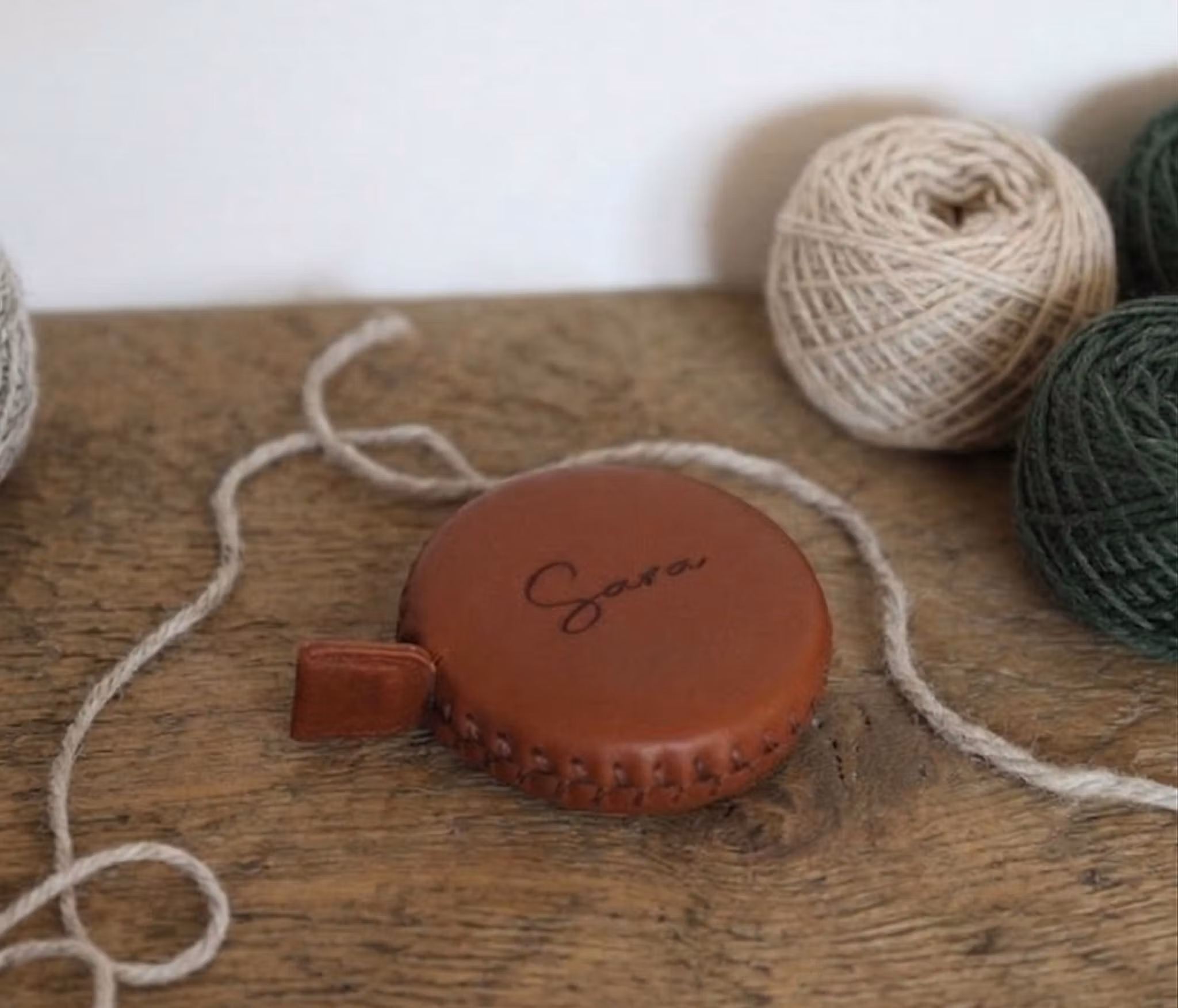 Måttband klätt i mjukt, högkvalitativt vegetabiliskt garvat renskinn och är det perfekta tillbehöret i varje stickkorg. Renskinnets naturliga struktur gör varje måttband unikt, och med tiden får det en vacker patina som bara blir finare med åren.