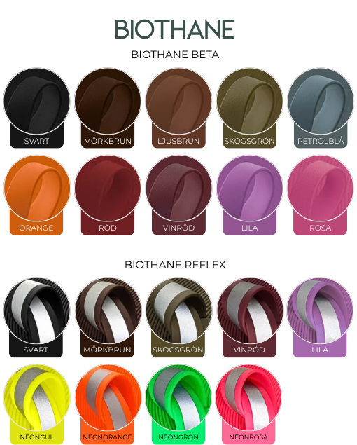 Biothane® coated webbing Beta är ett vattenavvisande material som har en oerhört hög hållfasthet och brottstyrka. Påminner om läder, men kräver ingen skötsel. Enkelt att tvätta av och blir inte smutsigt som ett halsband i tyg kan bli.