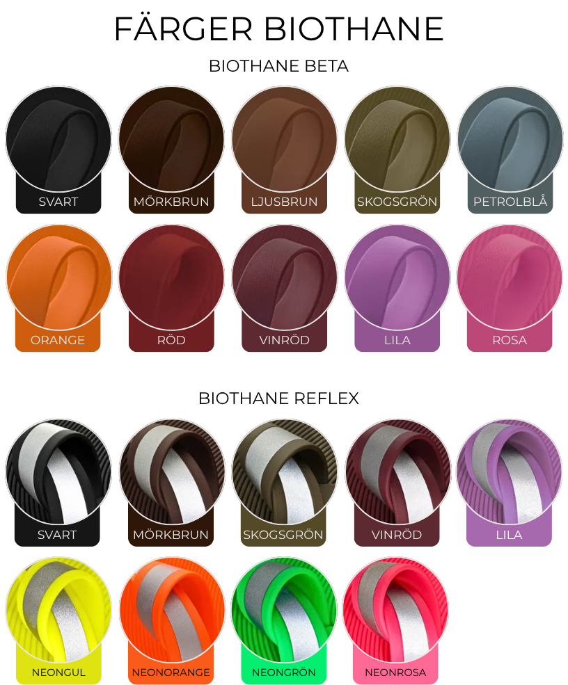 Biothane® coated webbing Beta är ett vattenavvisande material som har en oerhört hög hållfasthet och brottstyrka. Påminner om läder, men kräver ingen skötsel. Enkelt att tvätta av och blir inte smutsigt som ett halsband i tyg kan bli.
